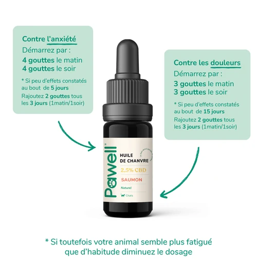 La posologie du CBD chez le chat varie en fonction de son poids. C’est pourquoi un tableau récapitulatif est inclus dans chaque commande, permettant d’administrer le bon volume d’huile à son compagnon.