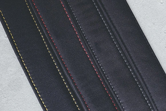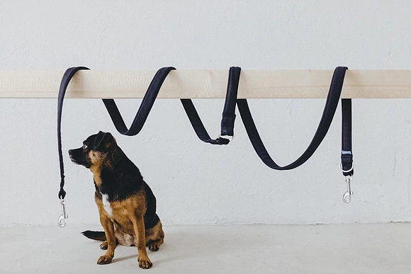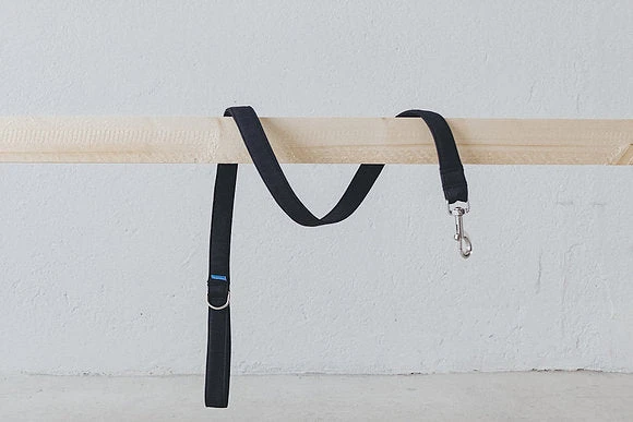 Laisse pour chien bleu marine en polyester recyclé avec des surpiqûres de couleur rouge ou jaune.
