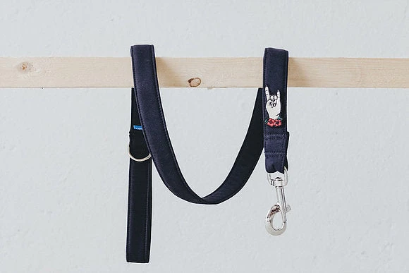 Laisse pour chien bleu marine en polyester recyclé avec une écusson cousu Yeah !