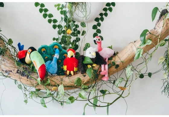 La collection de jouets tropicale de P.L.A.Y. est haute en couleur avec ces créatures adorables de la faune en forme de flamant rose, paon, toucan.