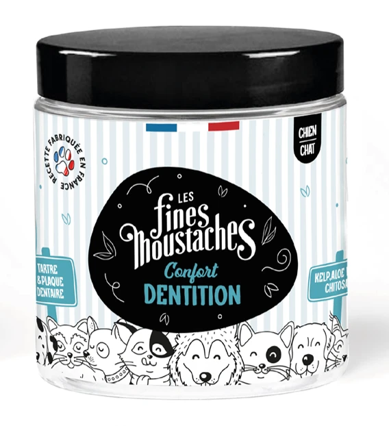 Le complément Confort Dentition de la marque LES FINES MOUSTACHES est un complément alimentaire naturel et complet pour une bonne hygiène bucco-dentaire des chiens et des chats.